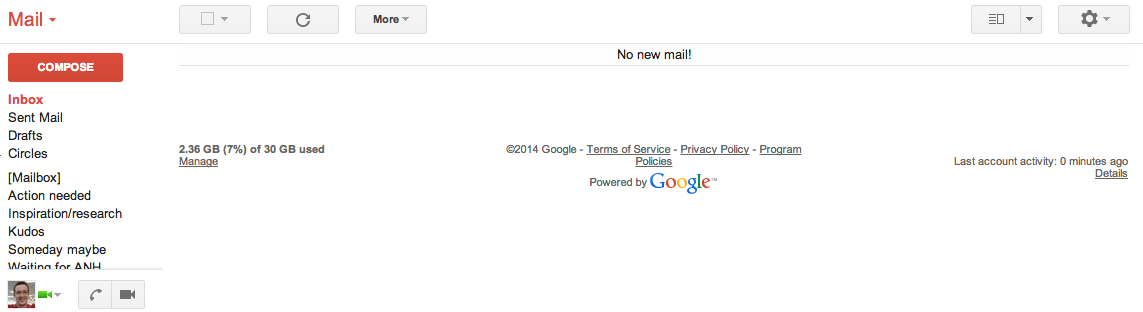 If an email needs more than 2 minute of attention, move it to ‘Action needed‘. If you’ve responded/instigated and are waiting for someone but don’t want to loose track of the project, move it to ‘Waiting for’. If it’s a longshot that you’ll prioritize it but don’t want to give up on it, move it to ‘Someday Maybe’. If it’s none of those – Archive it. Note: I’ve created 3 additional folders. Waiting for my boss (so I can keep our items separate), Kudos (props, thank yous and encouraging notes – not for vanity’s sake but on a rough day I skim these to turn my mood around in mere seconds) and Research (specifically for a project I’m working on – where these emails wouldn’t be easily found through the search function).